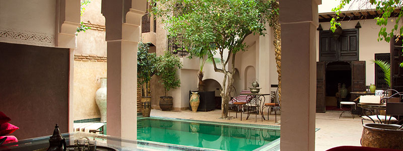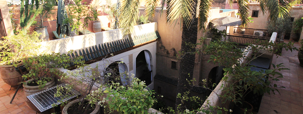 Disposé autour d’une grande piscine et d’un palmier centenaire, notre patio saura vous enchanter avec ses murs en pisé au couleur du Maroc.